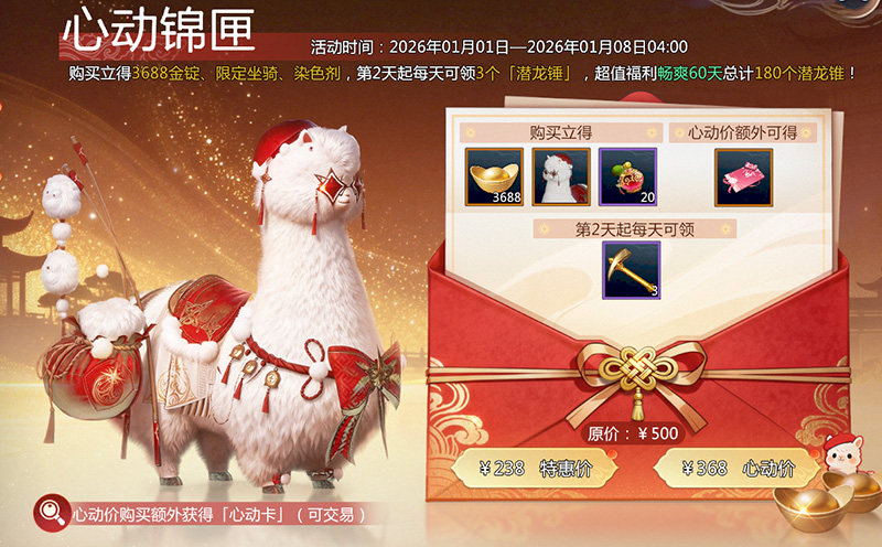 【馈礼】-【华章馈赠】上新超值礼盒【心动锦匣】!购买礼盒即可得限定坐骑-「福宝」、3688金锭、染色剂!此后,每日登陆还可额外领取潜龙锥(持续60天)!除此之外,礼盒更有“心动价”拼团惊喜优惠!