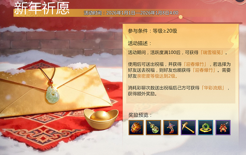 活动期间,少侠每日活跃度达到100点可领取【瑞雪福笺】,使用【瑞雪福笺】可为好友送上祝福,获得【迎春爆竹】(开启有机会得到聚灵葫芦、潜龙锥等奖励),消耗彩聊次数发送祝语可额外收获【华彩流烟】(开启有机会得到888金锭、聚灵葫芦、潜龙锥等奖励)。