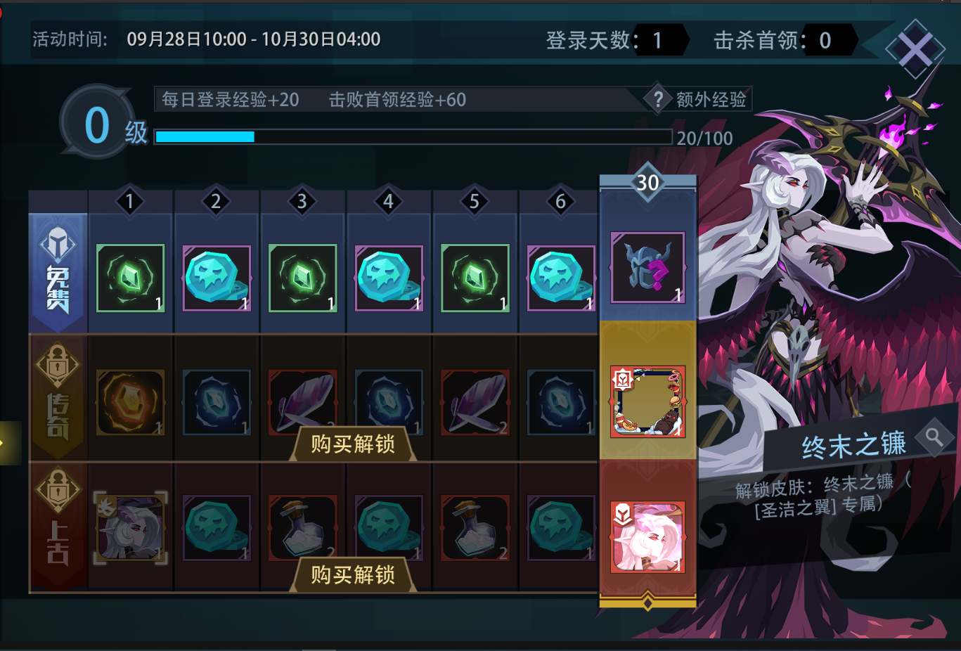 活动内容:活动期间,每日登录或击杀首领可获得经验;提升徽记等级。免费徽记默认开放,传奇徽记和上古徽记需购买解锁。徽记达到对应的等级,可领取对应档位的奖励。免费徽记可获得“勇士英魂”、“次元碎片”、“随机英雄”等好礼;传奇徽记可获得“传奇英魂”、“次元碎片”、“神祗碎片”、“限定动态头像框[假日时光]”等好礼;上古徽记可获得“幻彩之尘”、“英雄[圣洁之翼]的专属皮肤[终末之镰]”以及专属头像[终末之镰(闪)]等豪礼。