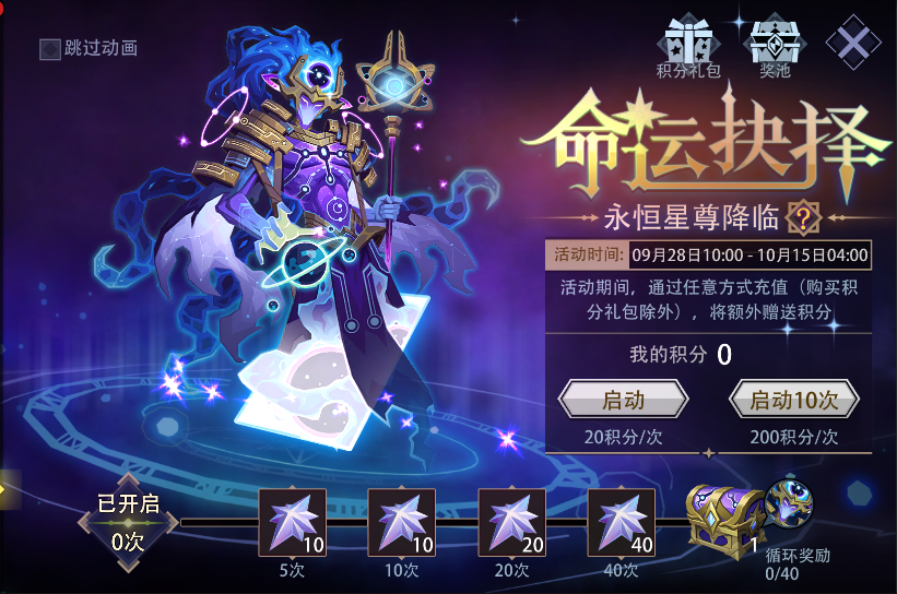 活动内容:活动期间,通过任意方式充值(购买积分礼包除外)额外赠送“积分”,1元等于1“积分”。需要消耗“积分”来启动游戏,可获得神系英雄[永恒星尊]、皮肤[邪燚王]、卡背[不湮暗星]、4款“动态头像”等。