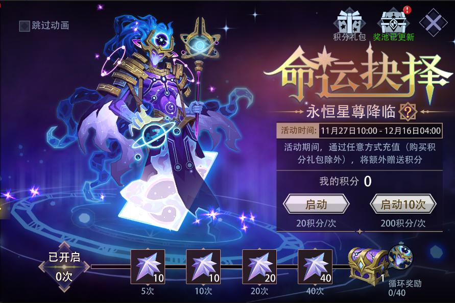 活动内容:活动期间,通过任意方式充值(购买积分礼包除外)额外赠送“积分”,1元等于1“积分”。需要消耗“积分”来启动游戏,可获得神系英雄[永恒星尊]、皮肤[神域龙裔]、卡背[不湮暗星]、4款全新的“动态头像”等。