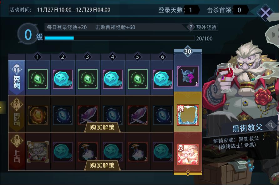 活动内容:活动期间,每日登录或击杀首领可获得经验;提升徽记等级。免费徽记栏默认开放,传奇徽记栏/上古徽记栏则需要购买解锁。徽记达到对应的等级,可领取已解锁栏位的所有对应档位的奖励。免费档为可获得次元碎片、随机英雄、魂石等好礼;传奇徽记可获得限定动态头像框[冰翼主宰]、传奇英魂、神祗碎片、次元碎片等豪礼。上古徽记可获得专属皮肤[黑街教父](镣铐战士专属)、限定动态头像[黑街教父(闪)]、幻彩之尘、史诗英魂等豪礼。