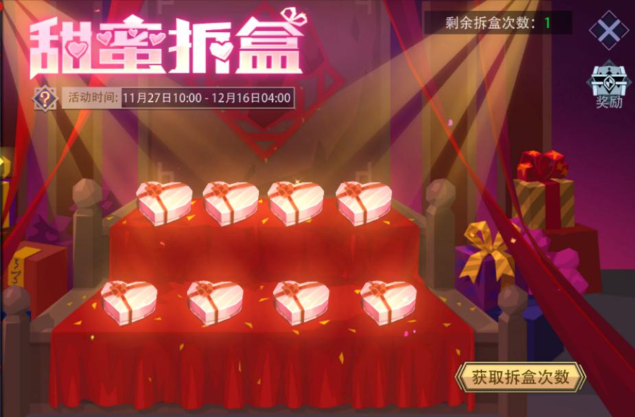 活动内容:活动期间,完成每日任务可获取拆盒次数;每日最多获得4次机会。8个礼盒包含8种奖励;每次拆盒会消耗一次拆盒次数并获得其中奖励。点击“奖励图标”可以查看奖励图鉴及当天已领奖励。次日04:00重置所有礼盒,并清空上一天的图鉴进度和剩余次数。