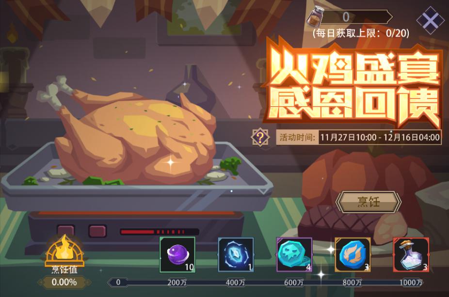 活动内容:活动期间,在[冒险模式/冒险试炼场/梦魇模式]下击败“首领”必定会掉落随机数量的“秘制调料”。点击“烹饪”按钮会消耗全部的“秘制调料”;能获得[魔晶]并随机增加全服烹饪值。当累计烹饪值达到一定阶段时,全服玩家还能获得额外奖励,包含[王者英魂]、[魂石]、[幻彩之尘]等。