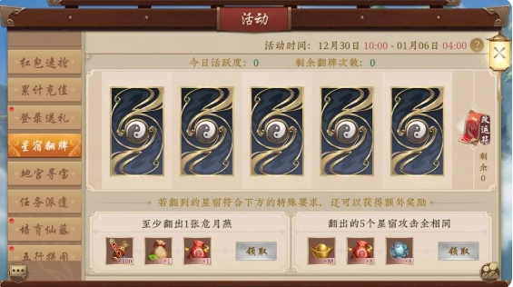活动期间,玩家每获得30点活跃度,便可获得1次翻牌机会,每日上限5次。每翻一张牌会消耗1次翻牌机会。