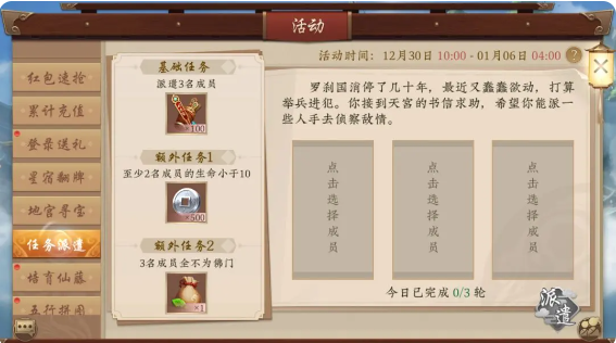 活动期间,玩家可以从自己已有的开天系列生灵中选择3个进行任务派遣。每日最多3次。