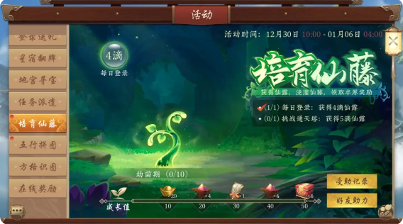 活动期间,玩家每日完成任务可为仙藤浇灌仙露,增加成长值。