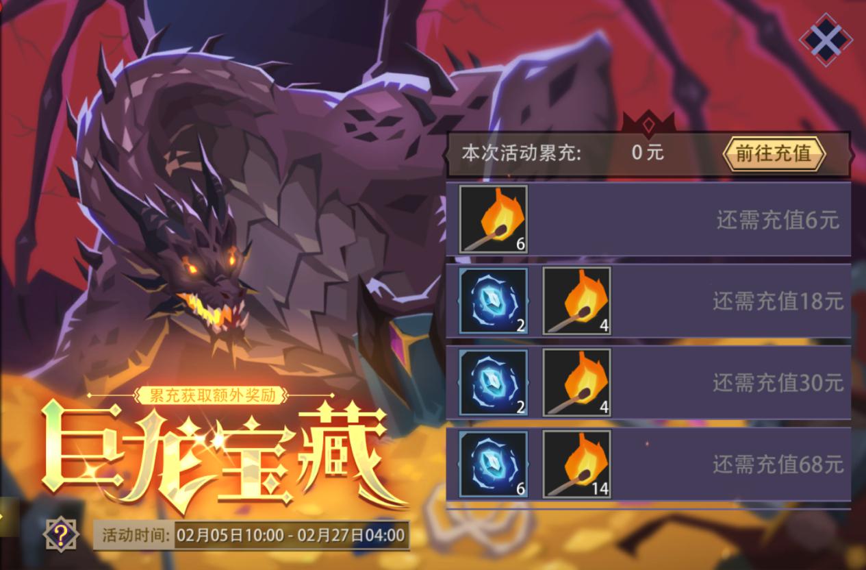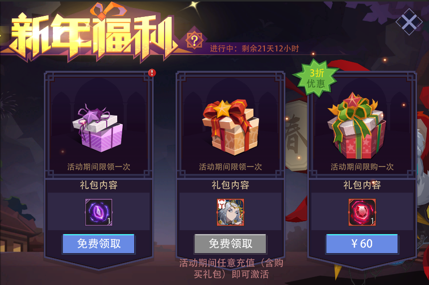 活动内容:新年福利礼包来袭。活动期间,登录游戏即可免费领取[史诗英魂]x1;活动期间任意充值(含购买礼包)即可免费领取“限定英雄”[玄光电女]x1;购买限定新年礼包可获得[上古英魂]x1。