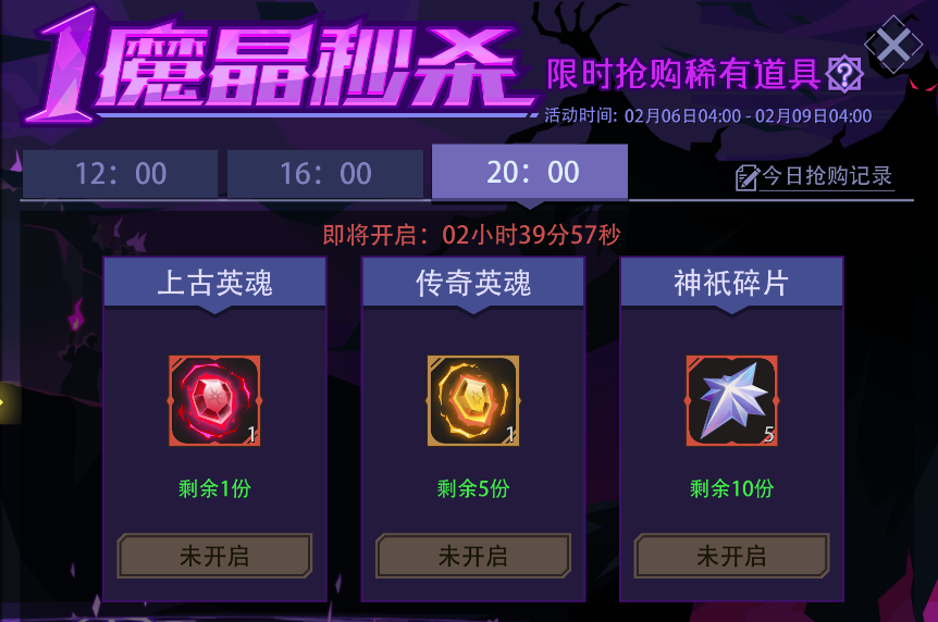 活动内容:活动期间,每日开启三场整点秒杀,分别为12:00、16:00、20:00。每场推出3款道具,仅需花费1魔晶即可抢购;道具数量有限,先到先得。该场次下所有道具抢购完毕,秒杀立即结束。成功抢购记录将公开,可在【今日抢购记录】中查看。
