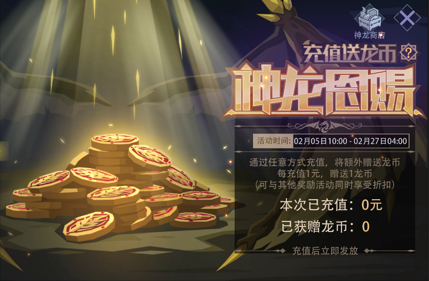 活动内容:活动期间,通过任意方式充值,将额外赠送龙币;每充值1元,赠送1龙币,赠送无上限。龙币可在“神龙商店”内兑换各种珍稀道具。