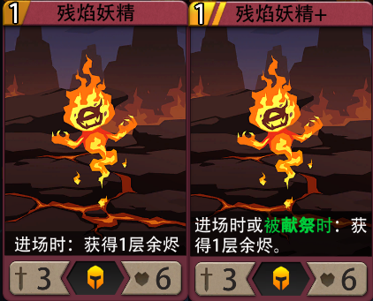1费生物卡,3攻6血。进场时(或被献祭时):获得1层余烬。