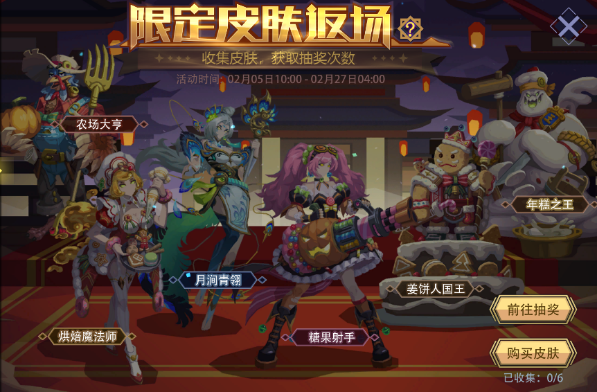 活动内容:活动期间,共有六款限定皮肤限时返场。每收集一款活动包含的限定皮肤,即可额外获得一次抽奖机会,可在“时来运转”活动中参与抽奖。