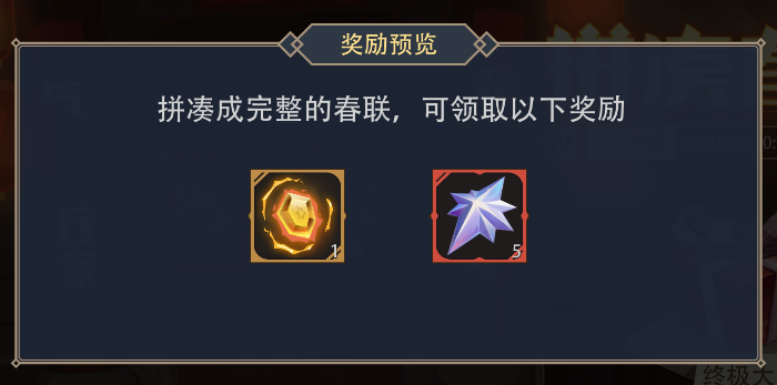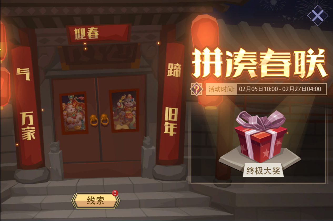 活动内容:爆竹声中一岁除,春风送暖入屠苏。千门万户瞳瞳日,总把新桃换旧符。活动期间,每日登录可激活一条线索。根据线索到指定页面收集“神秘汉字”即可领取线索奖励——“好运火柴”。集齐七组“神秘汉字"可拼凑出完整的春联,额外可领取“终极大奖”——[传奇英魂]x1、[神祗碎片]x5。