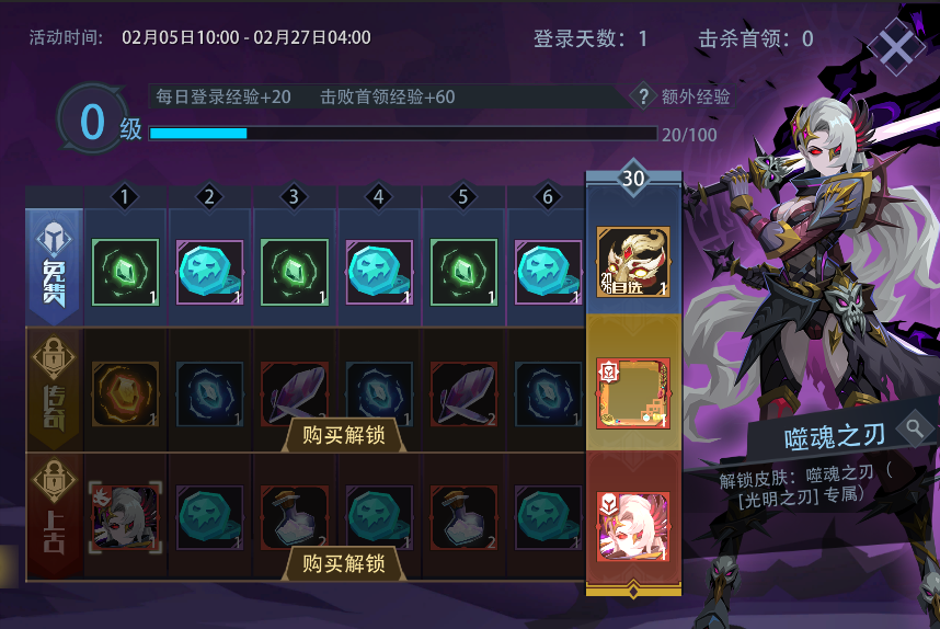 活动内容:活动期间,每日登录或击杀首领可获得经验;提升徽记等级。“免费徽记栏”默认开放,“传奇徽记栏”/“上古徽记栏”则需要购买解锁。徽记达到对应的等级,可领取已解锁栏位的所有对应档位的奖励。
