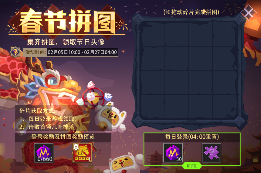 活动内容:活动期间,每日登录游戏可领取魔晶及随机拼图碎片奖励。另外,在(冒险模式/冒险试炼场/梦魇模式)下击败首领也有几率掉落拼图碎片。集齐所有拼图碎片并拼凑完整,还可以获得"春节限定头像"——[午马]。