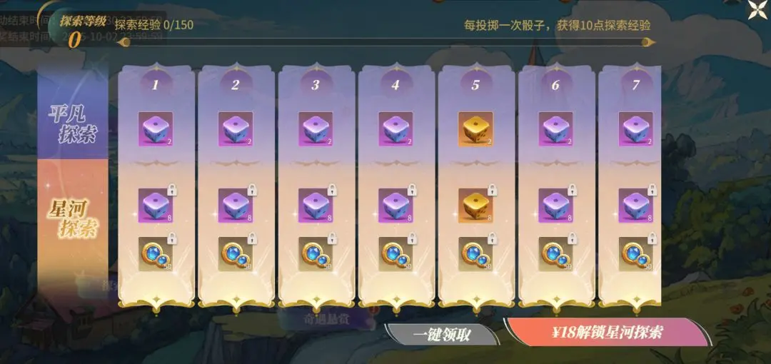 每投掷1次骰子,获得10探索经验;探索经验可用于激活奇遇基金的等级奖励;可选择18元解锁星河探索,获得更多的骰子和钻石奖励