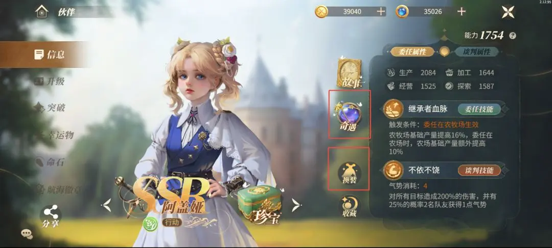 点击伙伴-信息,在信息界面,可以点击奇遇入口(36级开启)、换装。