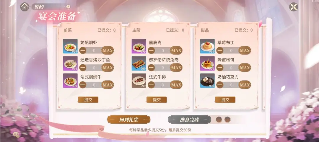 宴会准备阶段时,分为前菜、主菜、甜品、饮品4个类型,每个类型都提供3种可提交的菜品;