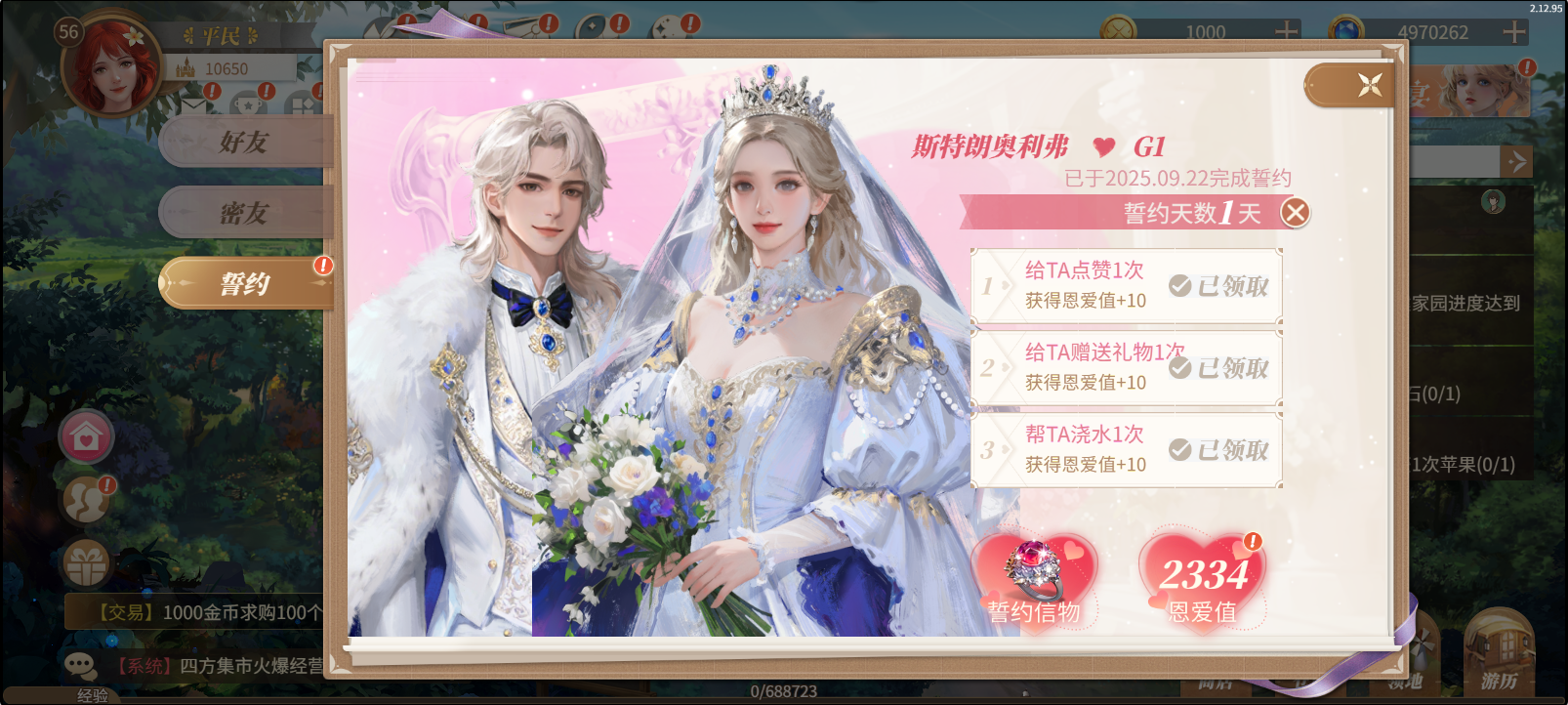 誓约完成后,点击誓约选项会出现双方形象展示和信物展示,每日任务可以获取恩爱值,达到对应的恩爱值可获取到钻石奖励,誓约天数累计达成也可获得钻石奖励。