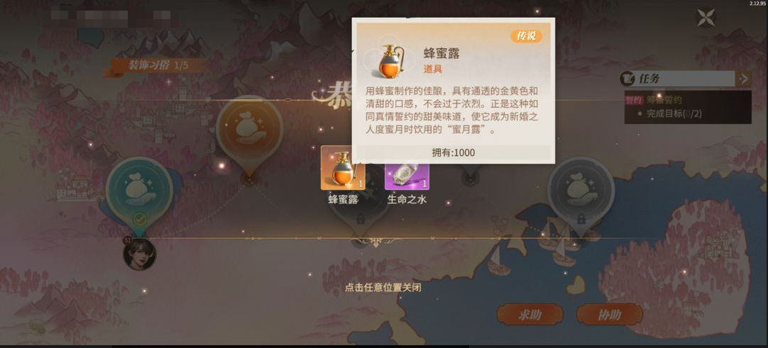 2.誓约筹备开始一共会有五个任务,双方共同完成自己的任务(可以求助或者协助对方)。完成任务会获取到(蜂蜜露,生命之水,情比金坚,酸甜之惑,冰蓝色的露珠仪式准备道具)