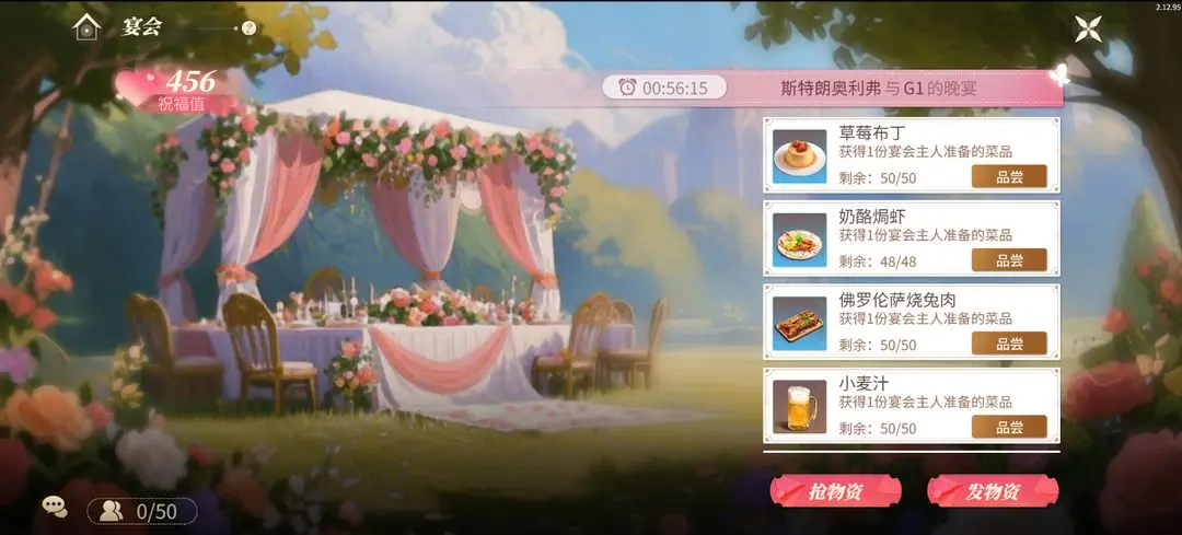 宴会开启后,房间中的宾客点击品尝菜品将获得一份誓约双方创建房间时提交的物资。每个类型的菜品每名宾客可品尝1次;宴会中所有人都可以发物资红包(分为专属红包:仅誓约双方可抢;全民红包:房间中所有人可抢)