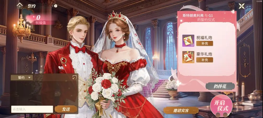 誓约仪式开启后双方可以邀请好友参加,使用房间中的礼炮祝福誓约双方。誓约双方完成宣誓后,将开启捧花倒计时,倒计时结束后开启仪式。