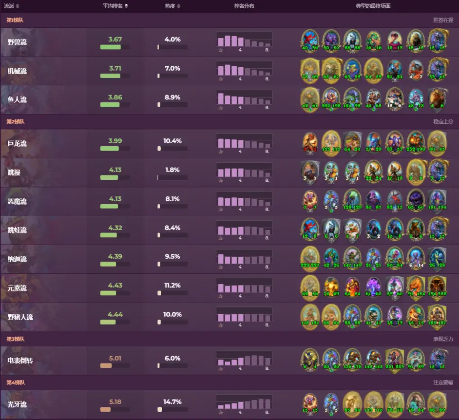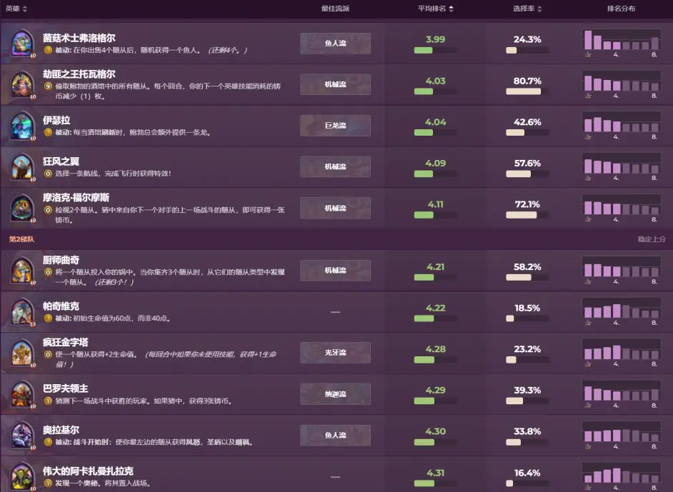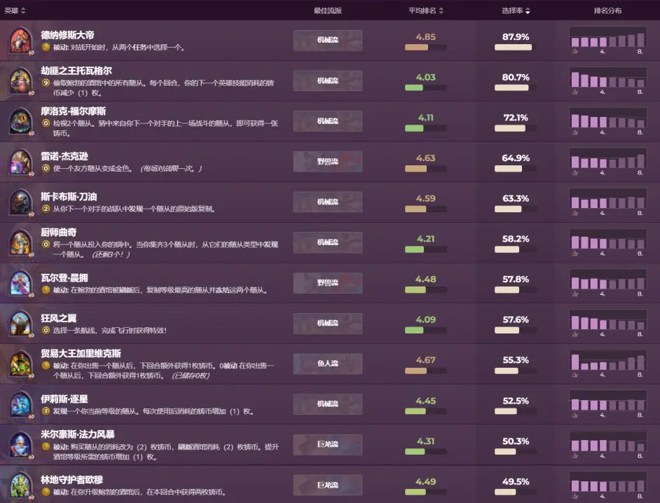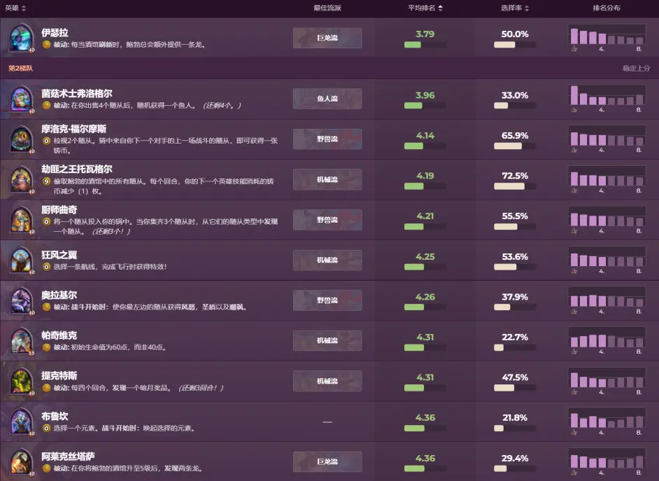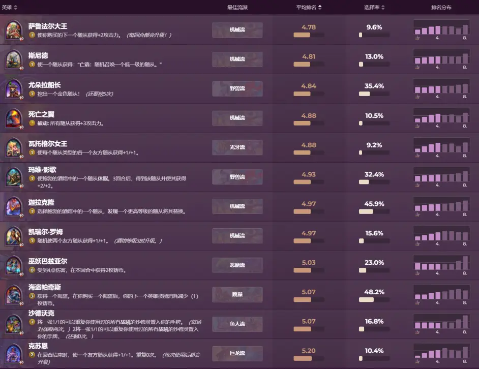 接下来就让我们看看平均排名垫底的英雄吧,像挖宝小狐狸,迦拉克隆都是比较看运气的英雄,挖/点出好随从了,就能够锁住血进而吃鸡,但大部分时间都是运气不好暴毙速八,而技能重做后的巫妖巴兹亚尔依然保持住了最高升本效率和最高速八率的双料冠军。