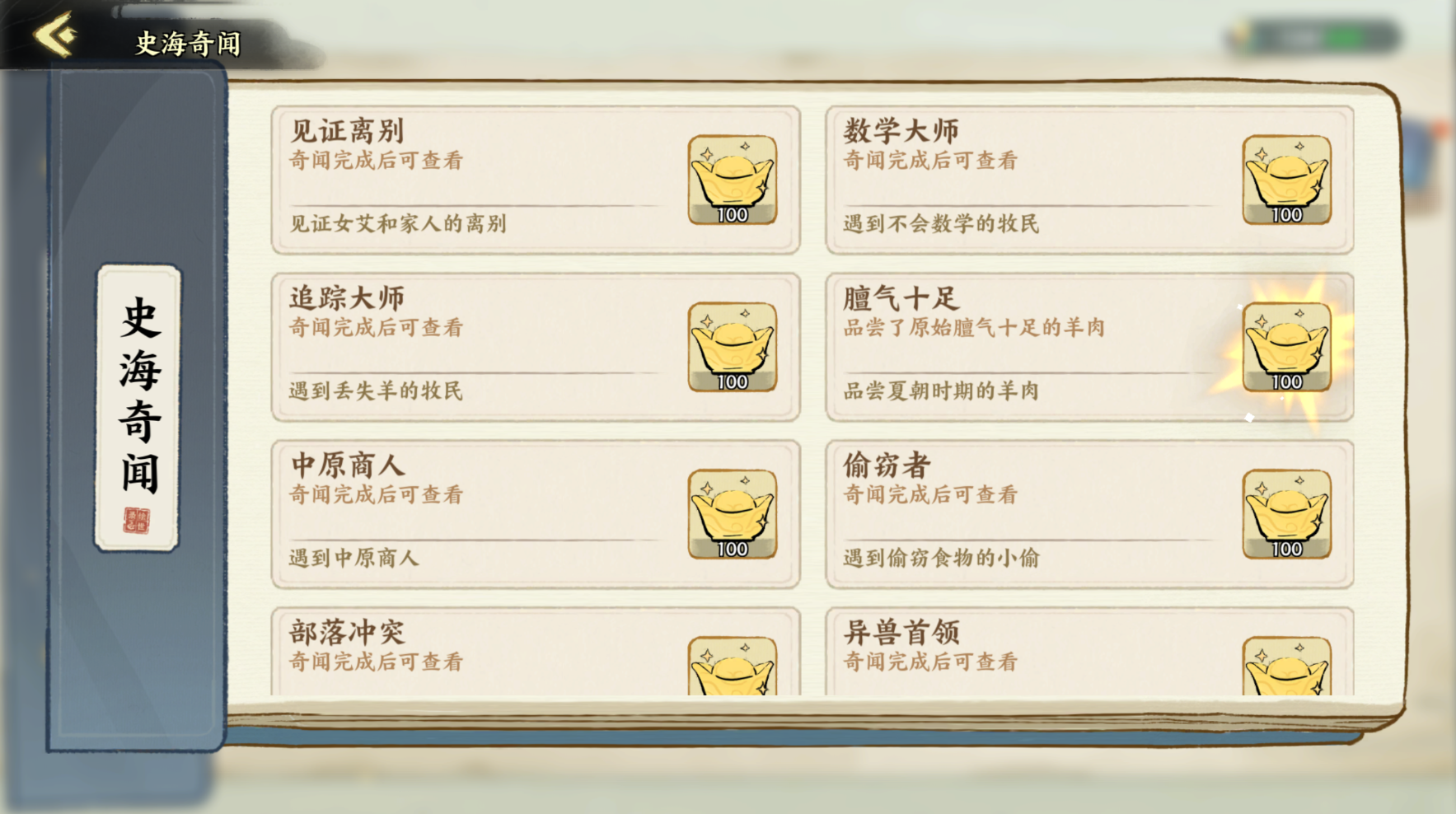 开启夏朝的史海,每次进入都随机可能获得奇闻,收集奇闻可以获得额外奖励