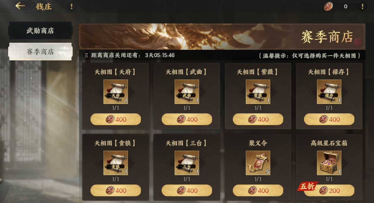上赛季结算获得的荣誉积分记得去赛季商店兑换掉,都是实打实的好东西。优先兑换打折的武将技能经验和征募令,另外,免费的招募次数也要在赛季卡池里及时使用。