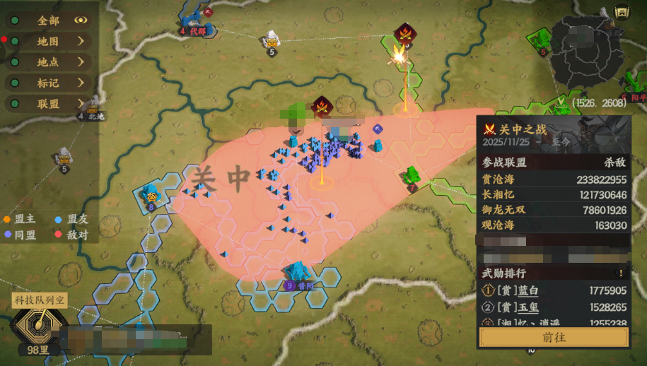此前,从两侧资源州进入关中的【长湘忆】与【赏沧海】,因数次长途远征消耗巨大。直到近期,【长湘忆】和盟友【御龙无双】与【赏沧海】正面接触,几番交锋后,才将战损逐渐扳回。