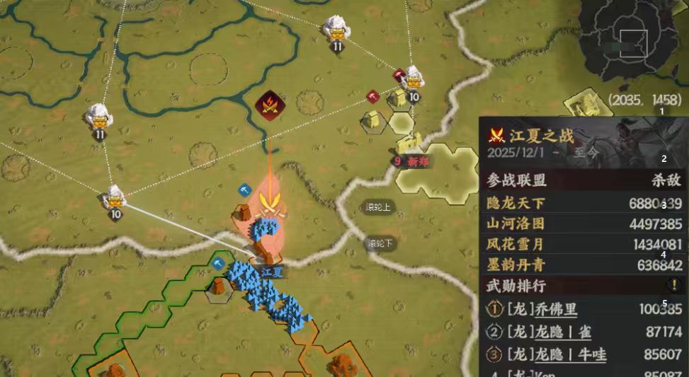五盟中,【隐龙天下】和【风花雪月】的战斗最为绵长,双方从六级关开放便持续交战,直到今日司隶开关才迎来短暂和平。但进关后,【隐龙天下】与【风花雪月】的战火又在九级关附近重新点燃!另一边,【墨韵丹青】和【诸侯世家】也激战不休,而【山河洛图】则不断远征,支援盟友【墨韵丹青】和【风花雪月】!