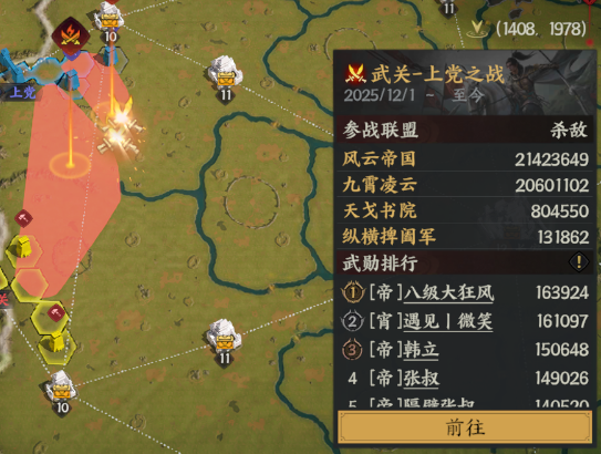 刚踏入司隶,【九霄凌云】与【风云帝国】便在上党与武关之间爆发战斗!双方攻势如潮,防守有序,战局陷入胶着,一时难分胜负。此时,尚未参战的【纵横捭阖军】与【天戈书院】动向成谜——他们会如何行动呢?