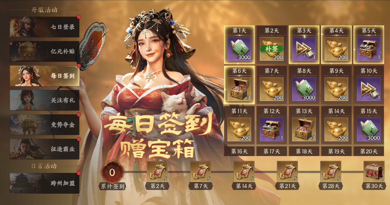 l 每日签到:元宝*3000、聚义今*25、核心武将自选宝箱*1