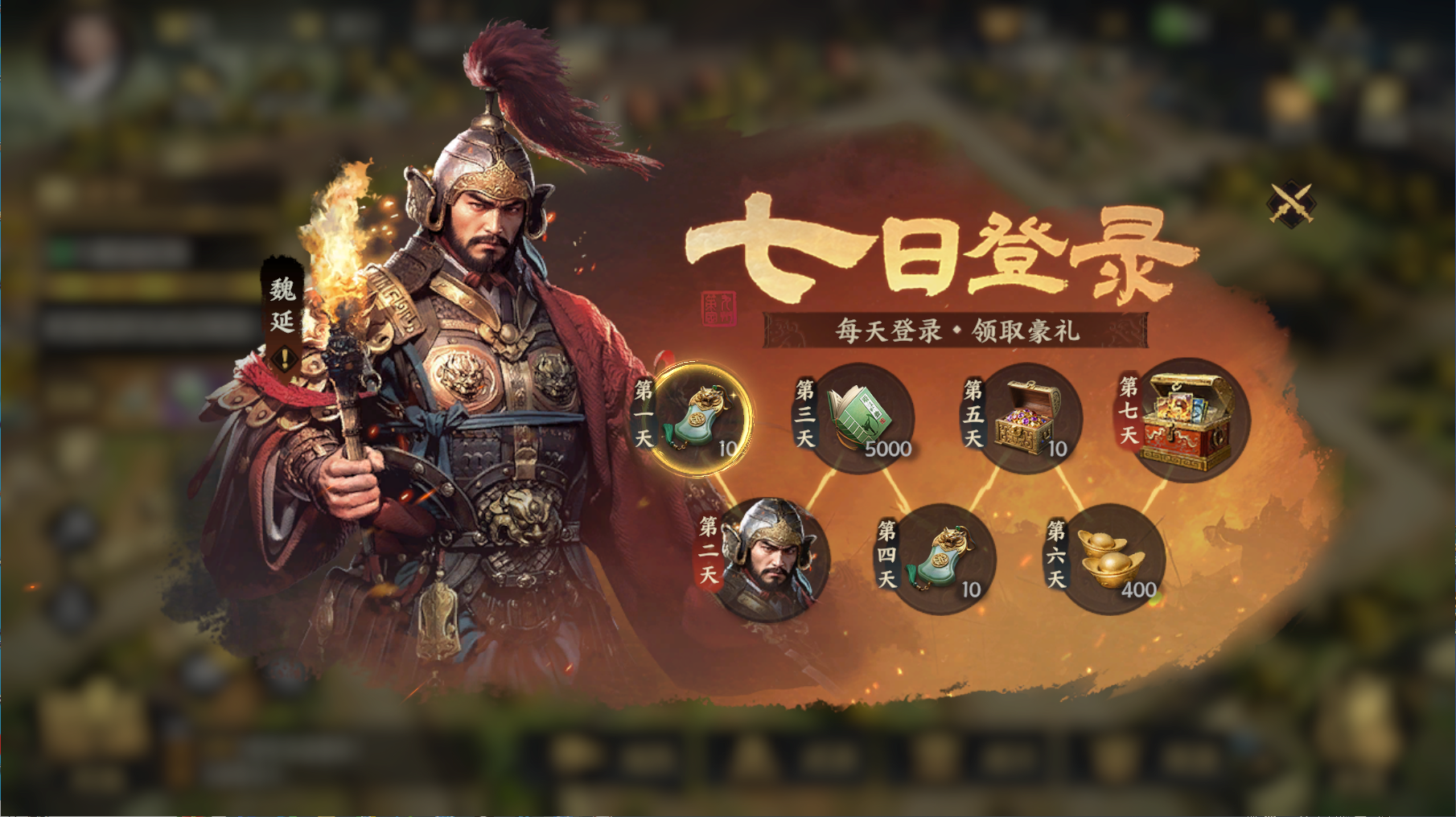 l 七日登录:元宝*400、募杰今*20、武将魏延、兵书自选宝箱精良*1