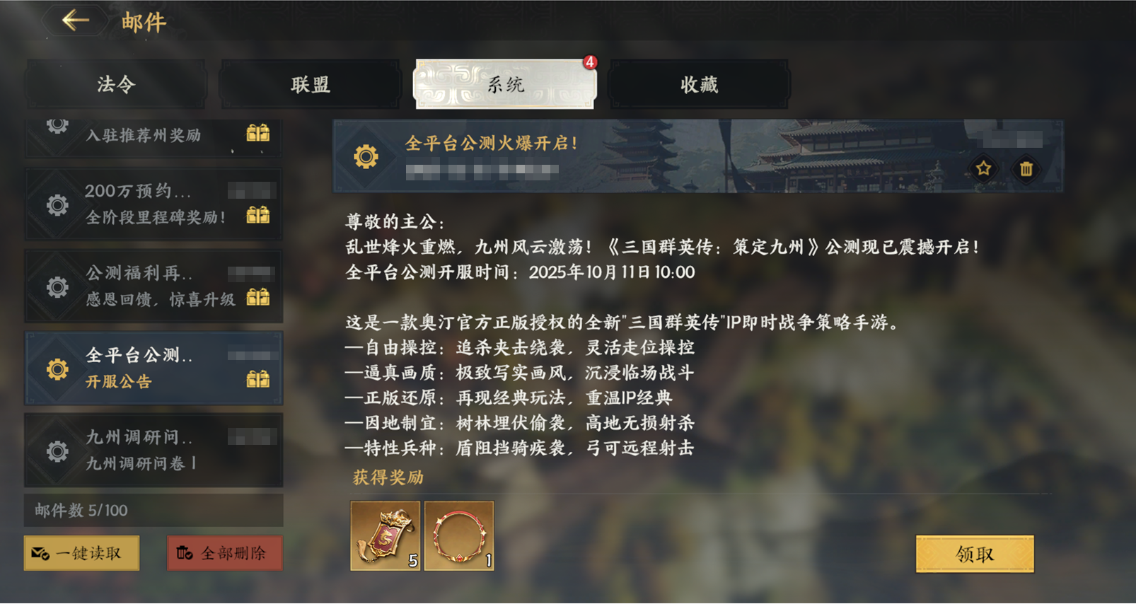 l 公测福利:聚义令*5、星耀九州头像框
