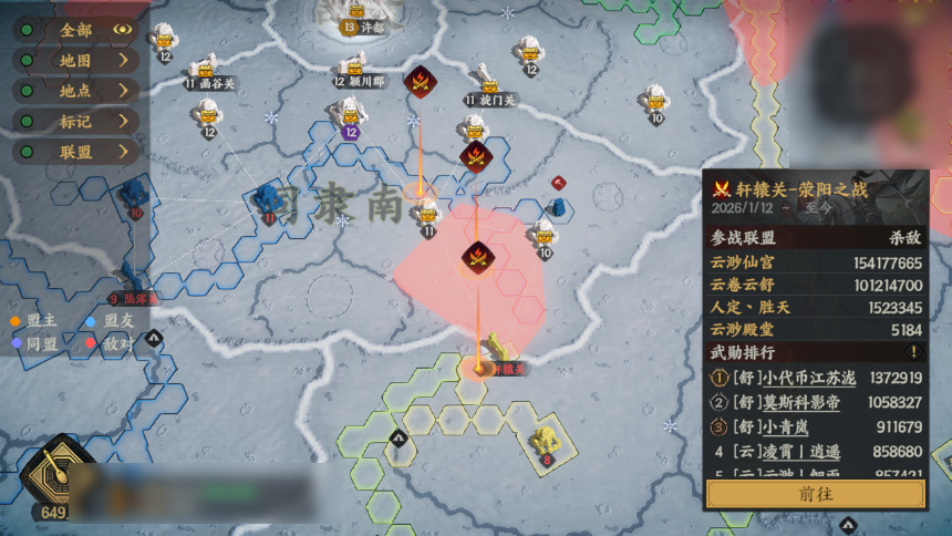 S3-12区司隶前线,【山河洛图】被【星汉丶挥戈】及其分盟联手压制,退守虎牢关,并且后者仍在持续组织进攻,意图将【山河洛图】彻底逼退;另一边,【西天取真经】稳步推进,已将道路铺至洛阳城下,逐步掌控核心地带。