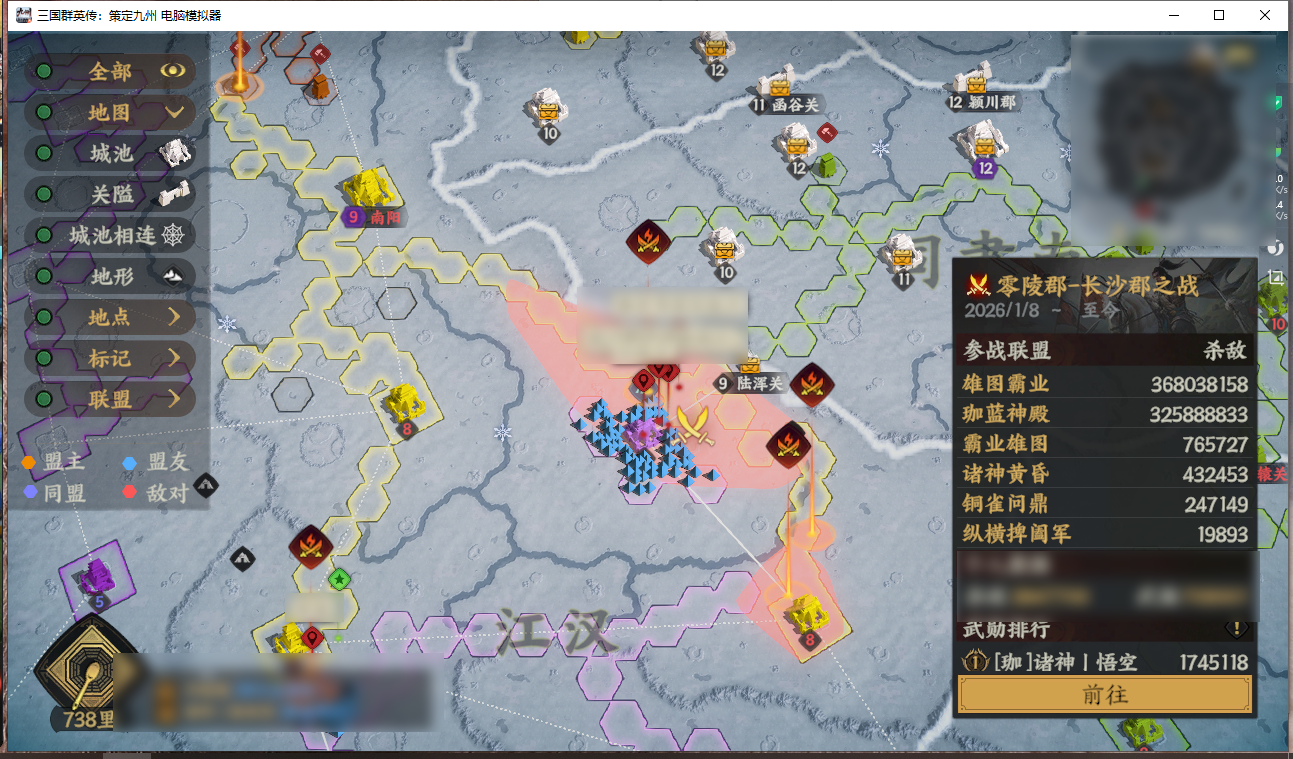 S3-9区的战火在江汉持续蔓延,【雄图霸业】与【珈蓝神殿】陷入持续缠斗。1月15日上午,【珈蓝神殿】尝试在7级城都阳周边建立烽火台夺取城池,不过迫于对手压力本次行动以失败告终;同时,他们的8级城零陵也在承受【雄图霸业】的猛烈进攻,防线承受重压。