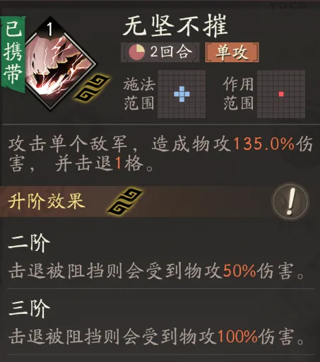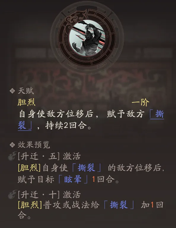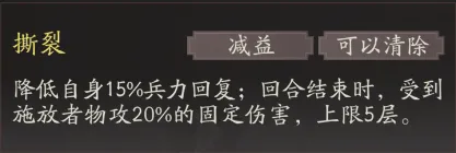 乐进的天赋胆烈可以使敌人在被自己击退后受到撕裂的减益效果,不仅回复兵力受损,还将持续受到伤害,堪称慢性死亡。