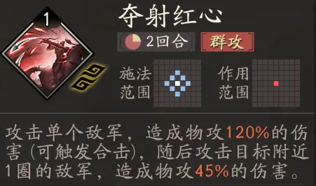夏侯渊还拥有弥补其范围伤害的多种主动技策,如夺射红心乱箭这两个技策,便可以对范围内敌军造成打击,进而击溃敌军。