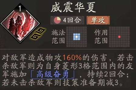 主动攻击后获得「再行动」,若未击杀敌军获得「拖刀计」,持续到敌方回合结束(间隔3回合触发);击杀敌军时获得「武魂」,上限2层。