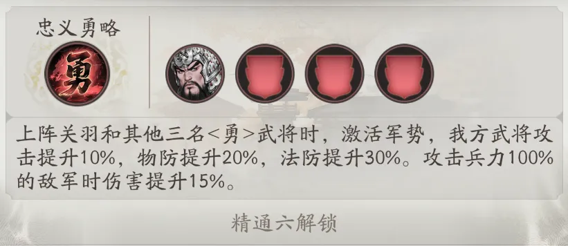 关羽作为超级别猛攻主将,作战风格为勇,拥有统帅系、骑兵系两条兵种进位选项。