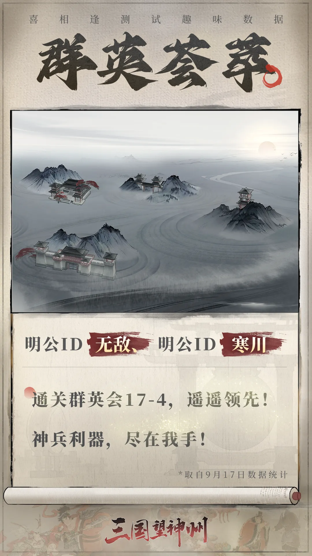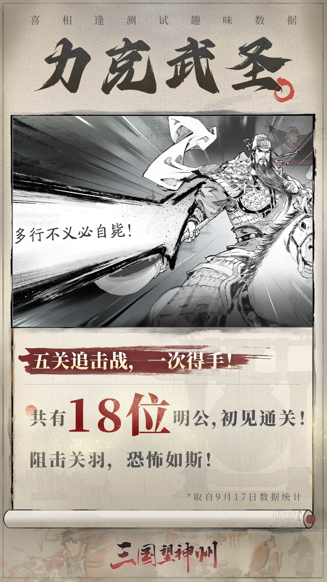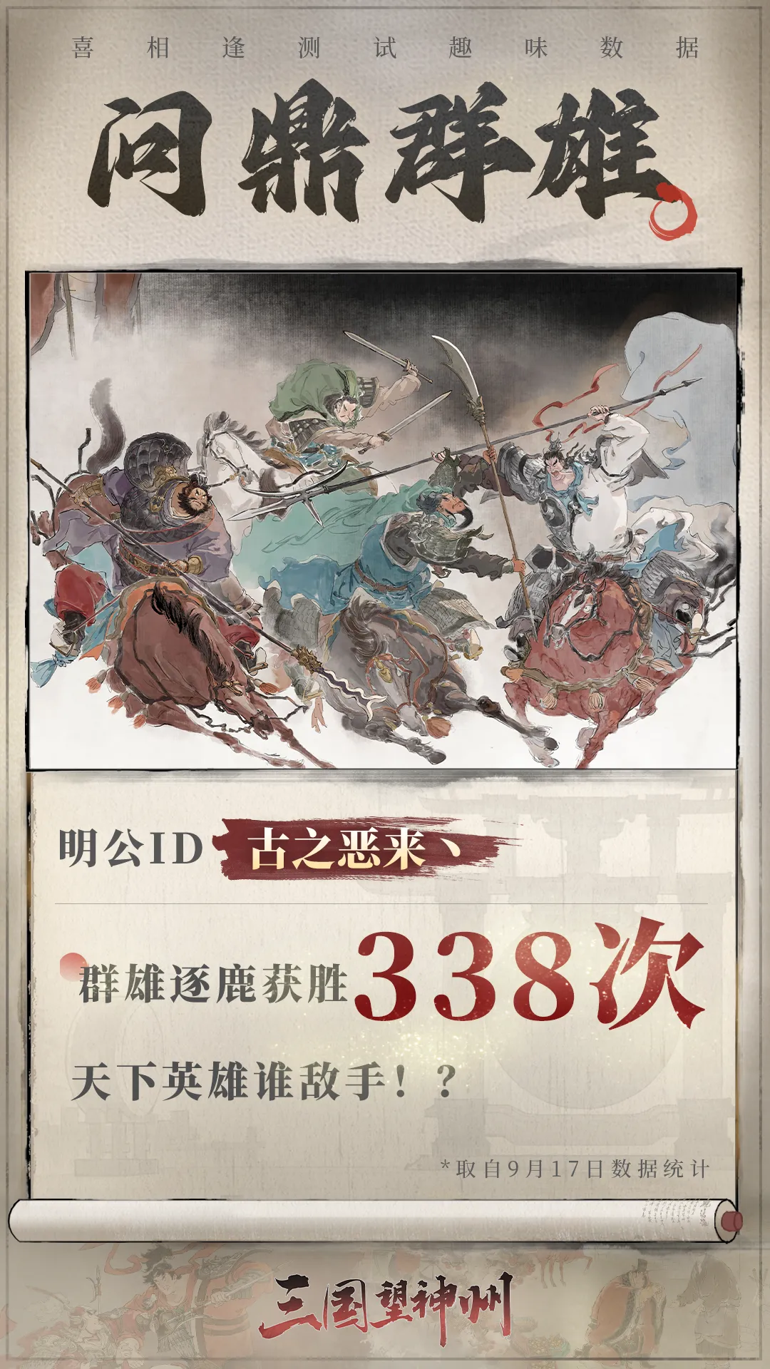 「喜相逢」测试已于昨日正式结束,本次测试中明公们不仅体验了全新的刘备主线剧本「匡扶汉室」以及全新主将关羽、张飞,大家还打出了不少有趣的亮眼数据。