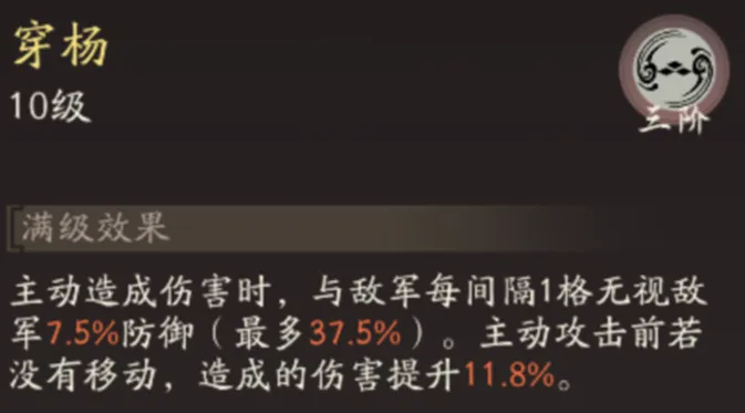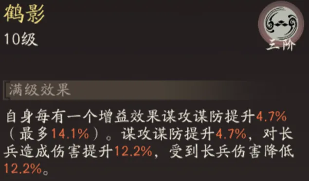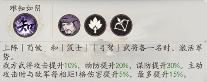 该军势需上阵荀攸和一名策士及一名弓弩武将即可激活,除了基础攻防属性的提升外,还能根据主动攻击时与敌军的距离获得更多增伤,是专属于远程兵种的军势,让策士和弓弩武将能发挥其远程炮台的威力。