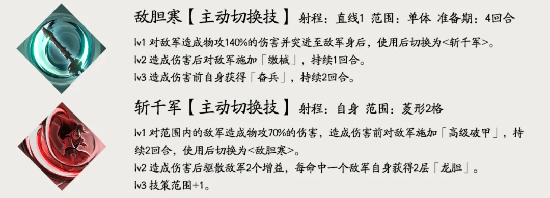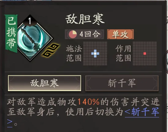 其第一个核心技能【敌胆寒】和【斩千军】是一个单体+群体的主动伤害类技能,其中【敌胆寒】技能和张辽的【突破】技能类似,都可以直接穿越敌人,不过其140%的伤害倍率可要比张辽的120%高一些,当然【突破】也有战前攻击力+10%的增益效果。