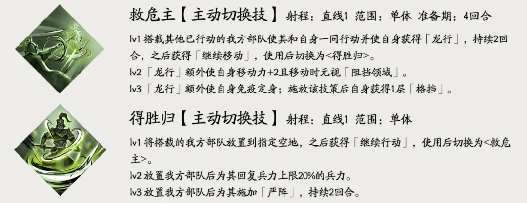 最后【救危主】和【得胜归】是一个机制为重的位移类技能,可以带着友方进行位移,这种技能在战棋游戏中也不少见了,其在很多特殊关卡战术制定上会有很大的积极意义。
