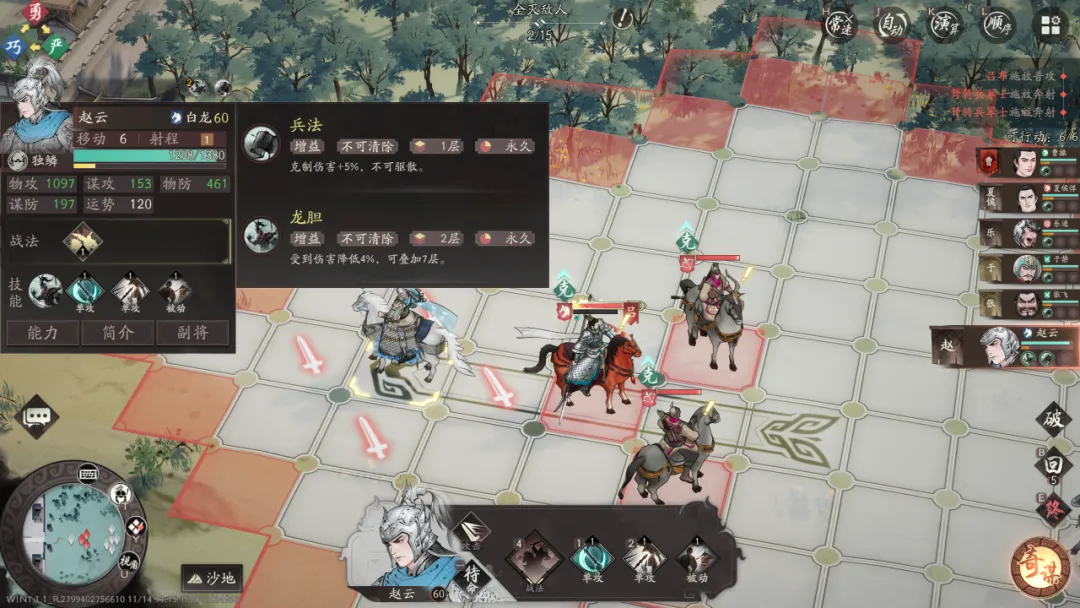 在目前最新版本中,主将的行动路径效果已经优化,可让赵云优先选择穿过敌人最多的路径,从而叠加多层龙胆。