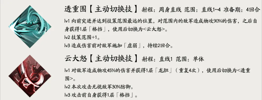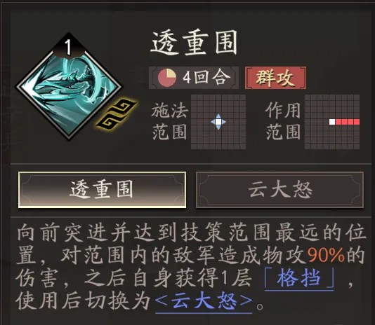 其中【透重围】是一个直线4个的穿刺技能,不过其伤害倍率要比张辽那个稍微低一点,但【透重围】还有直接获得1层格挡和转换技的优势。