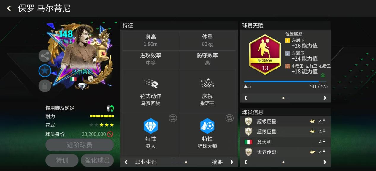 天赋方面,马尔蒂尼配备了坚如磐石,对他的加冲刺速度、长传、人盯人、拦截、侵略性五项数据提升显著,这让他在边路的防守表现得到一定的增强。在没有天赋加成的数据中,马尔蒂尼的加速、短传等多项进攻端数据,以及反应、滑铲、铲断等多项防守端数据都接近甚至突破950的数值,他是一名数据强度均衡的148卡王级别球员。