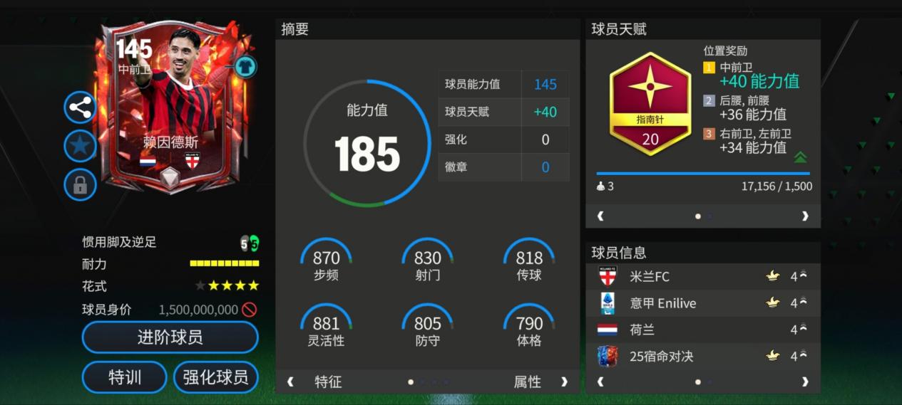 赖因德斯在宿命对决活动中推出了一张145能力值的球员卡。天赋配备了指南针,对他的多项中场关键数据都有提升。花式方面,马赛回旋确保了他的一对一摆脱能力,再加上赖因德斯10格的耐力,实战中他能更长时间保持稳定发挥。