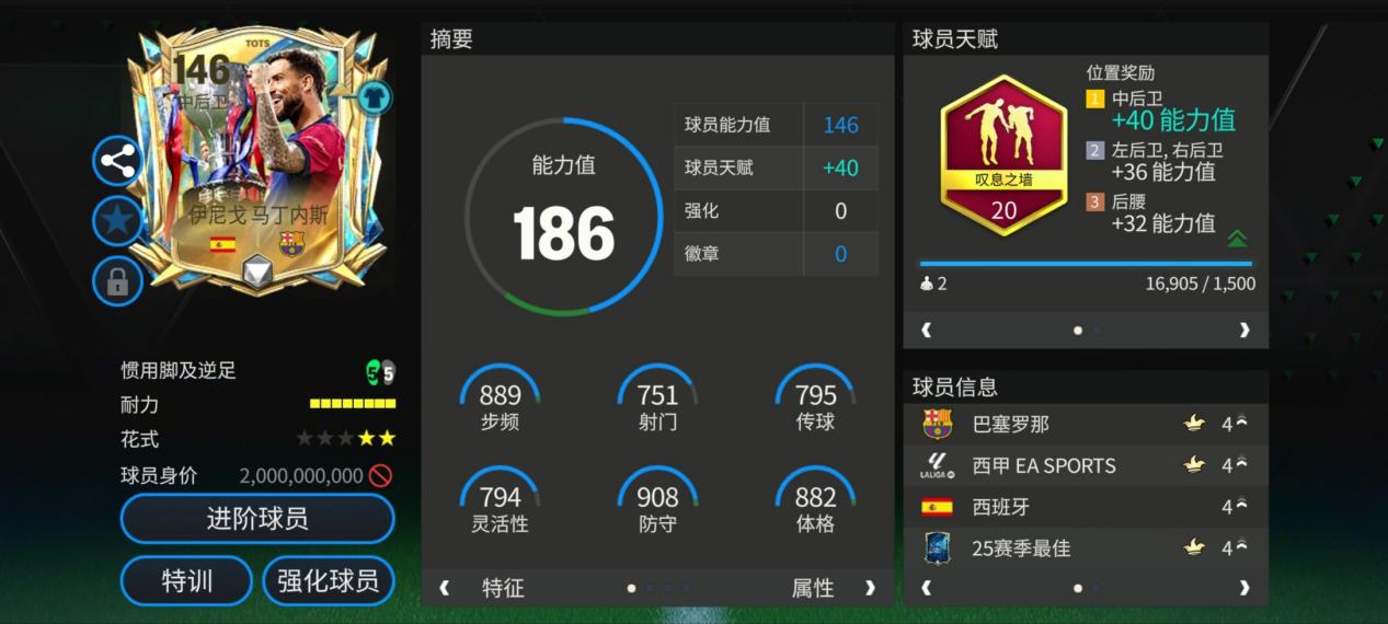 伊尼戈·马丁内斯在赛季最佳活动推出了一张146能力值的终极球员卡。天赋配备了叹息之墙,对他的防守端表现提升显著。尽管身材不算高大,但马丁内斯在场上的跑动范围大,补防协防积极,是一名灵活性出色的机动型中后卫。